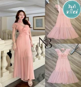 Maxi dress ผ้าชีฟองแขนระบาย มีซับในและฟองน้ำ งานซิบหลัง ชุดทรงแขนระบายและแต่งระบายใต้อก