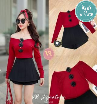 Set เสื้อยืดปาดไหล่แขนยาว เจาะเว้าเรียงด้านหน้าเล็กน้อย