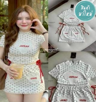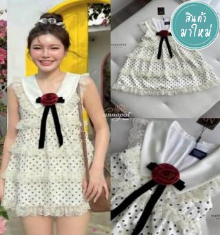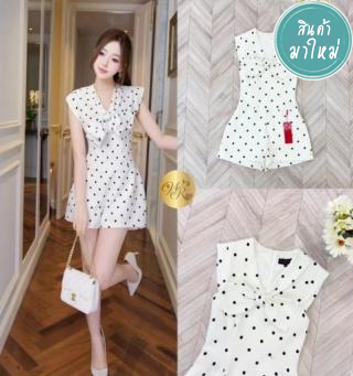 จั้มสูทขาสั้น แขนกุด คอปกพับ อกเย็บโบว์ เนื้อผ้าพิมพ์ลายจุด
