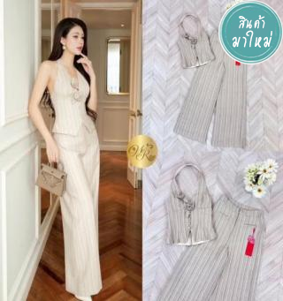 Set เสื้อคล้องคอกับกางเกงขายาว เอวสูง เสื้อเย็บดอกกุหลาบป๊อปอัพ