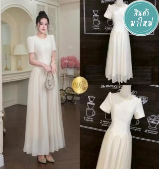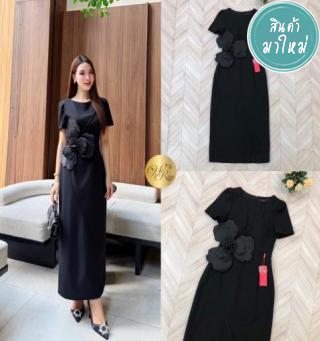 เดรสตัวยาว แขนสั้น เอวเย็บแต่งดอกไม้ ซิปหลัง ผ้าเรียบ สีพื้น