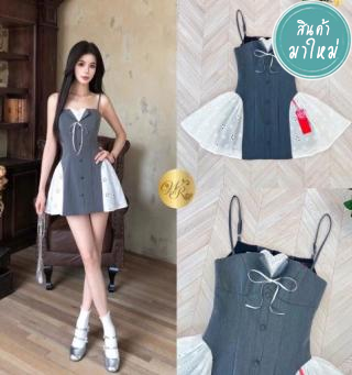 เสื้อสายเดี่ยว+กระโปรงสั้น เสื้อเย็บโบว์ แต่งกระดุม