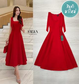 เดรสยาวสีแดงทรงเอไลน์ ดีไซน์คอเหลี่ยมเรียบหรู