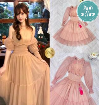 เดรสแขนยาว คอเหลี่ยม ช่วงกระโปรงทรงบานพอง ซิปหลัง เนื้อผ้าลูกไม้สีครีม