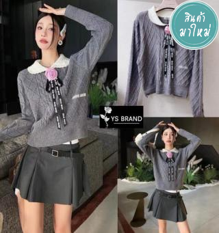 ชุดเซท 3 ชิ้น เสื้อแขนยาวคอวีแต่งคอปก มาพร้อมเข็มขัดติดกระดุมด้านหลัง งานสวยเนื้อผ้าดี