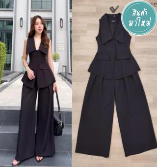 เซตกางเกงสูทแขนกุดดีไซน์ปกใหญ่ + กางเกงขากว้างสุดหรู