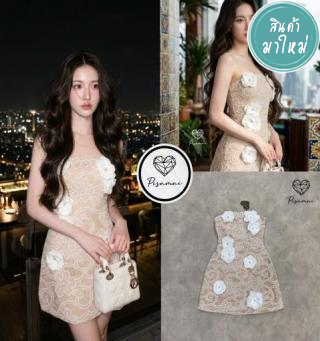 เดรสเกาะอกตัวสั้นลูกไม้ฉลุสีขาว แต่งดอกไม้3D แน่นๆ สวย หรู ทรงเป๊ะ