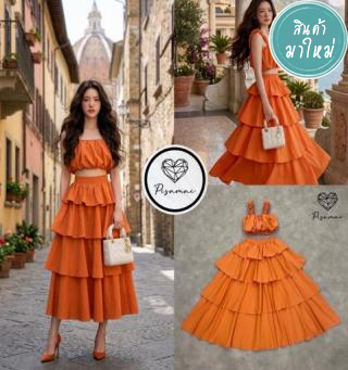 เซ็ตเสื้อคอปสีส้ม มาคู่กับกระโปรงเอวสูงชัเนตังบาน ความกระโปรงเลเยอร์ฟูฟ่อง