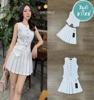 Set เสื้อเกาะอกกับกระโปรงสั้น เสื้อกระดุมทอง กระโปรงเอวสูง
