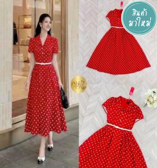 แม็กซี่เดรสตัวยาว คอปก แขนสั้น มีเข็มขัดโบว์ให้ 1 เส้น ติดกระดุมหน้า