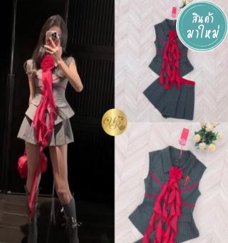 เซท 2 ชิ้น เสื้อแขนสั้นแต่งคอกลมแต่งโบ