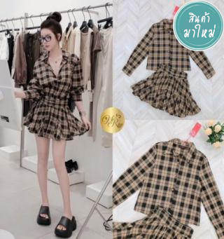Set เสื้อเชิ้ตแขนยาวกับกระโปรงสั้น เนื้อผ้าลายสก็อตสีน้ำตาลดำ