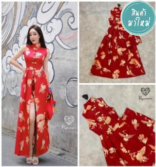 เดรสกี่เพ้าแขนกุดตัวยาวสีแดงพิมลายนกสีทอง