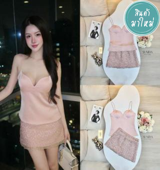 เสื้อสายเดี่ยวเว้าหน้าอกผ้าซาตินเงา งานซิปข้าง+ กระโปรงวิ้งๆ