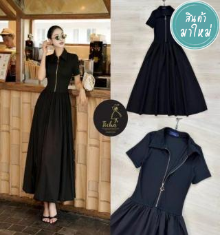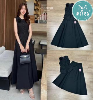 เดรสคอปกเชิ้ตตัวยาวสีดำแต่งกระดุมหน้าเรียง