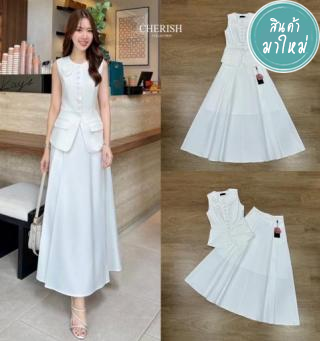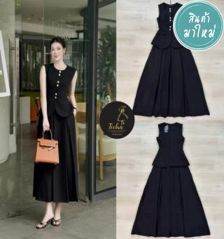 ชุดเซ็ท เสื้อ+กระโปรง สไตล์คุณหนู เรียบหรูดูผู้ดี เสื้อแขนกุดตัวยาวตกแต่งกระดุม