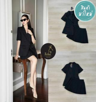 เซ็ตเสื้อสูทเบเซอร์ oversize ทรงเป๊ะ มาคู่กับกระโปรงฟูตังยาวสีดำ