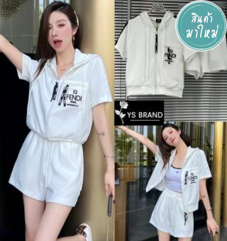 Set 2 ชิ้น เสื้อเบเซอร์แขนสั้นทูโทน คอปก ดีเทลแต่งเว้าไหล่