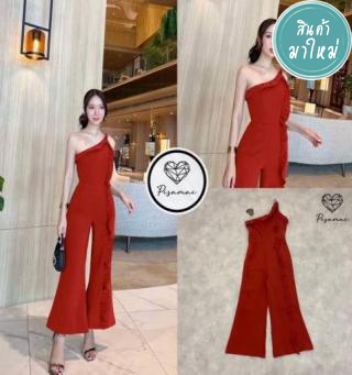 จั้มสูทไหล่เดียวขายาวสีแดงอมส้มแต่งดีเท็ลระบาย มาในดีไซน์เรียบหรู