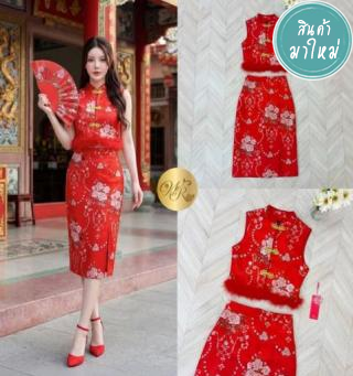 Set เซ็ตกี่เพ้า เสื้อแขนกุดกับกระโปรงยาว 5 ส่วน