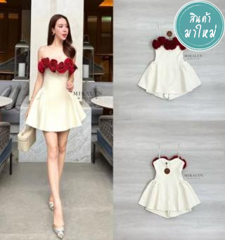 มินิเดรสสายเดี่ยวสีครีมแต่งดอกไม้สีแดง