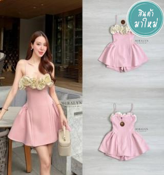 มินิเดรสสายเดี่ยวสีชมพูแต่งดอกไม้สีครีมช่วงอกแบบสวยน่ารัก