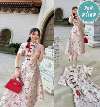 เดรสแขนสั้นคอจีนคลาสสิก มาคู่กับกระเป๋าใส่ส้ม/ซองแดง ดีไซน์ชุด แต่งกุ๊นขอบช่วงอกแต่งกระดุมด้วยผ้าสี