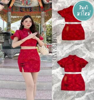 SETกี่เพ้าลายดอกไม้สีแดงลายสวยมากค่ะ เสื้อแขนกุดแต่งกระดุมขนนก มีฟองน้ำ