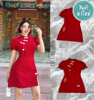 มินิเดรสสีแดงด้านหน้าแต่งกระดุมจีนสีขาวและพุ่แดง ดีไซน์แขนสั้นเย็บจีบ