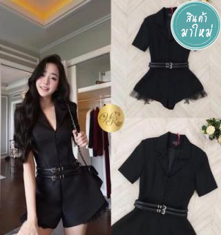 จั้มสูทขาสั้น แขนสั้น มีเข็มขัด 2 เส้น ปกคอทรงสูท กระดุมหน้า