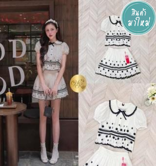Set เสื้อแขนพองกับกระโปรงสั้น เสื้อคอบัว อกมีเข็มกลัดโบว์ ติดกระดุม