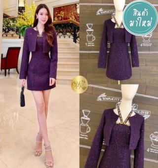 เสื้อแจ็คเก็ตกับเดรสสายคล้อคอ สายเย็บด้วยครีสตัล เดรสทรงเข้ารูป