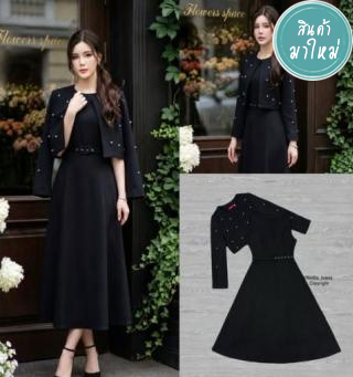 เดรสนิตติ้งดำสอบยาวคอเหลี่ยมแขนกุดเพชรดอก
