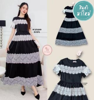 เดรสยาวดีไซส์คอกลม สีดำแต่งตัดสลับกับลูกไม้สีขาว