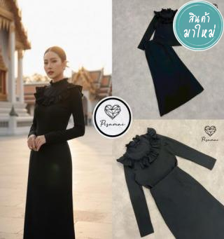 เดรสคอปกตัวยาวสีดำกระโปรงบานมาพร้อมเข็มขัด