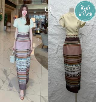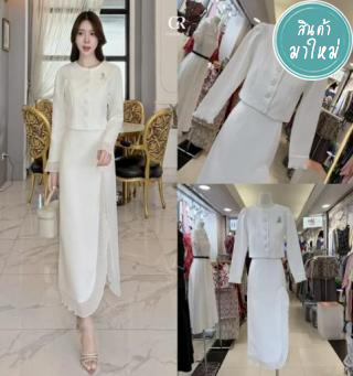 ชุดไทยประยุกต์ เซ็ท 3 ชิ้น เสื้อทรงคอจีน ไหล่ยกเล็กน้อยเพิ่มความอ่อนหวานและดูทันสมัย