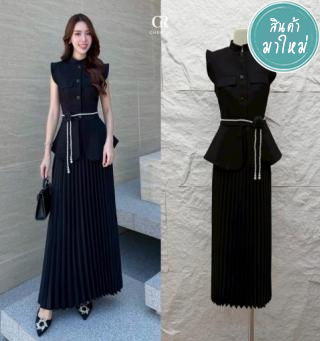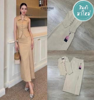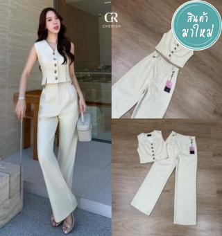 ชุดเซ็ท เสื้อกั๊กแขนกุดตกแต่งกระดุม เข้ารูป
