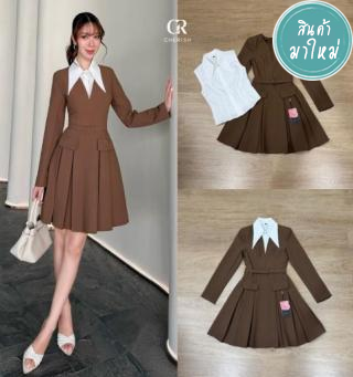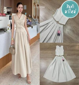 ชุดเซ็ท สาวใสวัยทำงาน เสื้อ+กระโปรง ตัวเสื้อกั๊กตกแต่งกระดุมสุดคลาสสิค