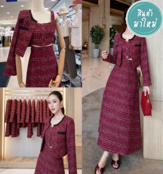 งานหรูหรากับเซ็ทสูทผ้าทวิตแต่งกระดุมเพชรหรู 4 เม็ดใหญ่ด้านหน้า