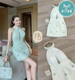 มินิเดรสคล้องคอเว้าหลัง ดีไซน์แต่งกระดุม ติดเพชรรอบอกและชายกระโปรง  [พร้อมส่ง]