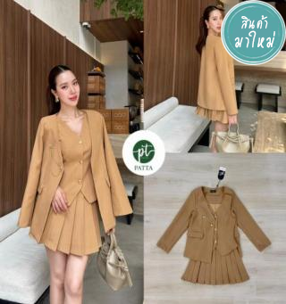 Set 4ชิ้น เสื้อสูท+เสื้อกั๊ก+กระโปรง+เข็มกลัด เสื้อคลุมสูทแขนยาวสีน้ำตาล