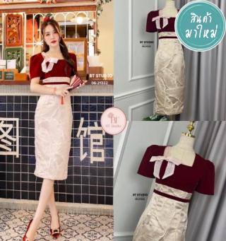 เดรสยาวประมาณเข่าดีเทลด้านบนกำมะหยี่แดงคอตัดสี่เหลี่ยมแต่งโบคาดสายแต่งเข็มกลัดโบ