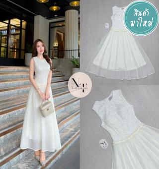 ลูกไม้แขนกุดสีครีม แต่งกระโปรงด้วยผ้าชีฟอง