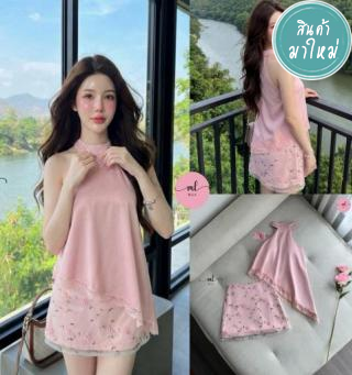 เซ็ต 2 ชิ้นโทนชมพูหวานละมุน เสื้อคล้องคอทรงแขนกุด ผ้าทิ้งตัวสวย