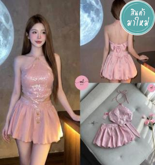 เซ็ต 2 ชิ้นโทนชมพูหวานละมุน ดีไซน์สายเดี่ยวคล้องคอ แต่งอะไหล่ทองตรงช่วงอก