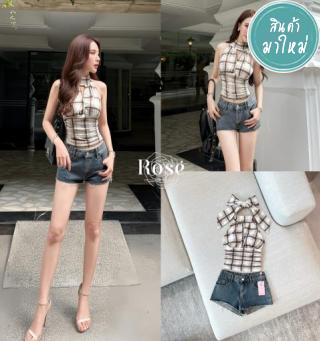 Set เสื้อแขนกุดทรงฮาโลเตอร์คอสูงดีไซน์ลายตารางโทนอบอุ่น