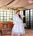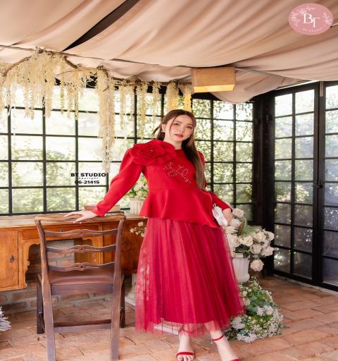 DETAIL : เซ็ท 2 ชิ้น เสื้อแขนยาวคอกลม แต่งดอกไม้ใหญ่อลังที่หัวไหล่ แต่งก้านปักด้วยลูกปัดและคริสตัล ปลายชายแต่งระบายไล่ระดับ มาพร้อมกระโปรงอัดพรีทมีซับใน งานสวยเนื้อผ้าดีมีซับใน
