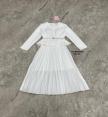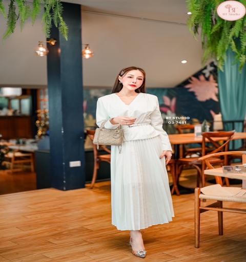 เซท 3 ชิ้น เสื้อแขนยาวคอวีตีเกล็ดตรงกลางปลายชายบานออกเล็กน้อย มาพร้อมกระโปรงเอวสูงอัดพรีท