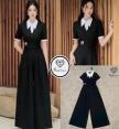 เซ็ตเสื้อเชิ้ตแขนสั้นคอปกขาวดำ มาคู่กับกางเกงขายาวทรงกระบอก