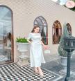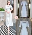 เดรสยาวแขนสี่ส่วนช่วงไหล่แต่งโบทั้งสองข้างเว้าสามเหลี่ยมช่วงเนินอกเล็กน้อย